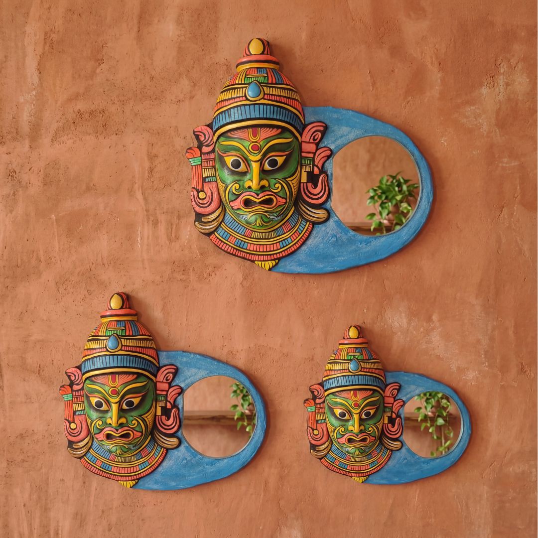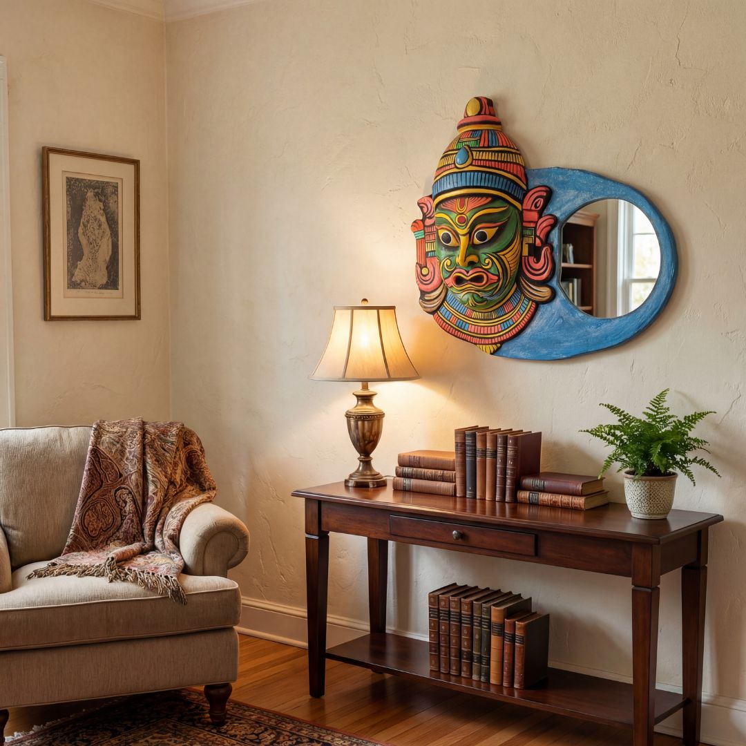 Inspired by Purulia’s 500-year-old Chhau mask tradition, it is reimagined for contemporary spaces with bold contours, layered colours, and an embedded mirror that reflects light and movement in your home.